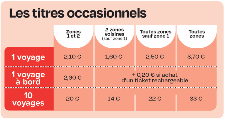 Les nouveaux tarifs selon les zones (abonnements et titres occasionnels)